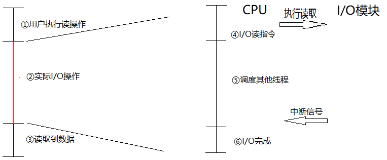 在实际的I/O操作过程中,CPU向I/O模块(DMA控制器)发送读指令,然后就去调度其他线程。