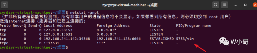 此时查看靶机上的连接,可以看到可疑的 vim 连接