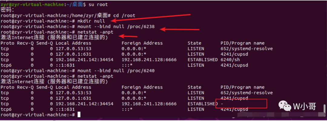 mkdir nullmount --bind null proc/6238netstat -anpt#mount --bind命令是将前一个目录挂载到后一个目录上,所有对后一个目录的访问其实都是对前一个目录的访问,并且会将前一个目录路径隐藏起来(注意这里只是隐藏不是删除,数据未发生改变,仅仅是无法访问了)。
