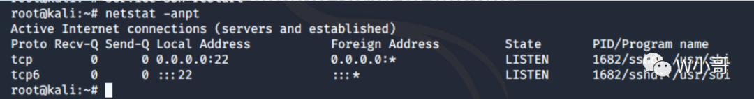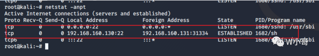 执行完命令之后就回车即可,接下来就是已经控制了受害者kali,与受害者的22好端口建立连接,如下图所示