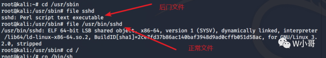 其实这款后门也比较好发现,首先正常的sshd 文件是ELF格式,而后门是纯文本脚本,使用file 命令就可以发现