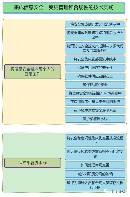 我们不是在开发流程结束时才进行产品的安全性检查,而是要把安全控制整合到开发和运维团队的日常工作中,让安全成为所有人日常工作的一部分。理想情况下,这项工作将以自动化的形式集成到部署流水线里。此外,我们还将通过自动化控制来优化手动操作、验收和审批流程,逐渐降低对职责分立和变更审批流程等控制的依赖。