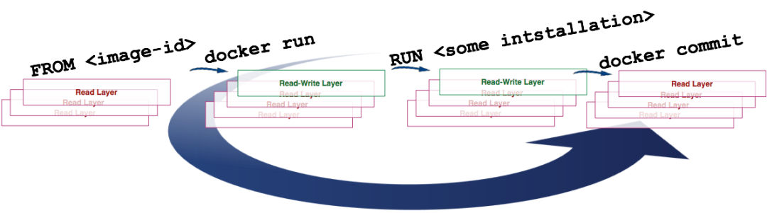我们从上图可以看到,build命令根据Dockerfile文件中的FROM指令获取到镜像,然后重复地1)run(create和start)、2)修改、3)commit。在循环中的每一步都会生成一个新的层,因此许多新的层会被创建。