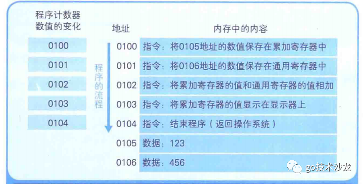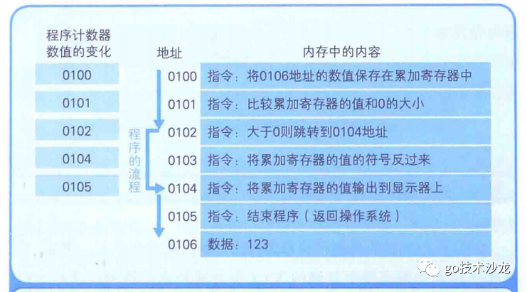 此处 指令“大于0则跳转到0104地址”,间接执行了“将程序计数器设定为0104地址”这个操作。在循环中也是根据机器指令(jump)跳转指令完成执行顺序的调整,同时这里运用CPU中的标志寄存器存储累加寄存器的运算结果是负数,零还是正数。比较运算的结果存储到标志寄存器中。