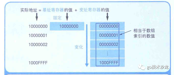 基址寄存器存储数组的起始地址,变址寄存器则用于存储整个连续地址的变化。