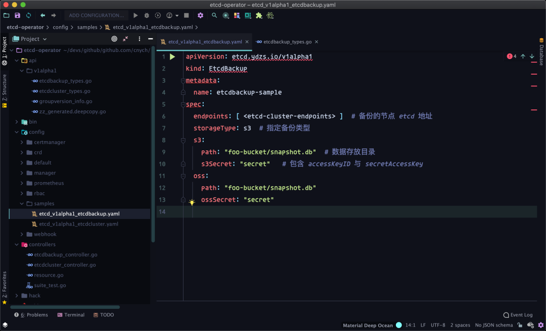 创建完成后,在项目中会新增 EtcdBackup 相关的 API 和对应的控制器,我们可以用上面设计的 CR 资源覆盖 samples 目录中的 EtcdBackup 对象。