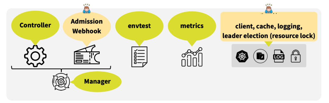 实例化 manager,参数 config 向 manager 添加 scheme 向 manager 添加 controller,该 controller 包含一个 reconciler 结构体,我们需要在 reconciler 结构体实现逻辑处理 向 manager 添加 webhook,同样需要实现逻辑处理 启动 manager.start()