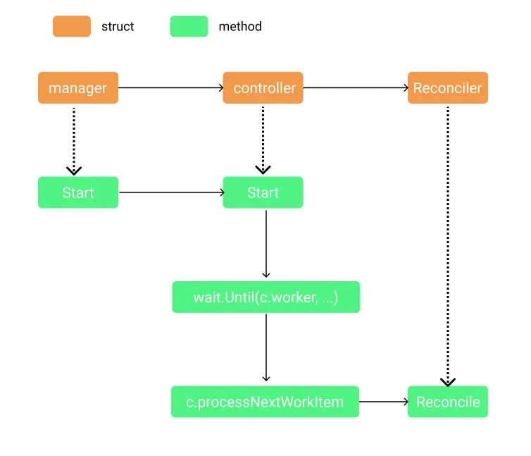 可以看到最终还是去调用的 Runnable 的 Start 函数来启动,这里其实也就是 Controller 的 Start 函数,前文我们已经详细介绍过,这个函数相当于启动一个控制循环不断从工作队列中消费数据,然后给到一个 Reconciler 接口进行处理,也就是我们要去实现的 Reconcile(Request) (Result, error)