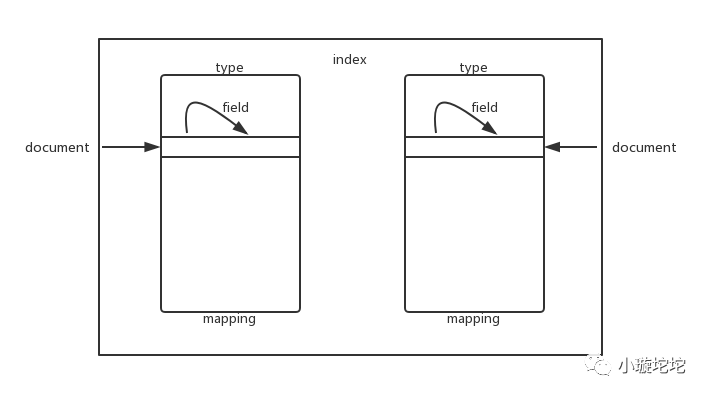 很多情况下,一个index里可能就只有一个type,但是确实如果说一个index里有多个type的情况,你可以认为index就像一个数据库,一个数据库有多个type表,每个表有多个document行,每行也会有多个field字段的值,而mapping对应这个type的表结构定义,但在es7.x已经被移除。
