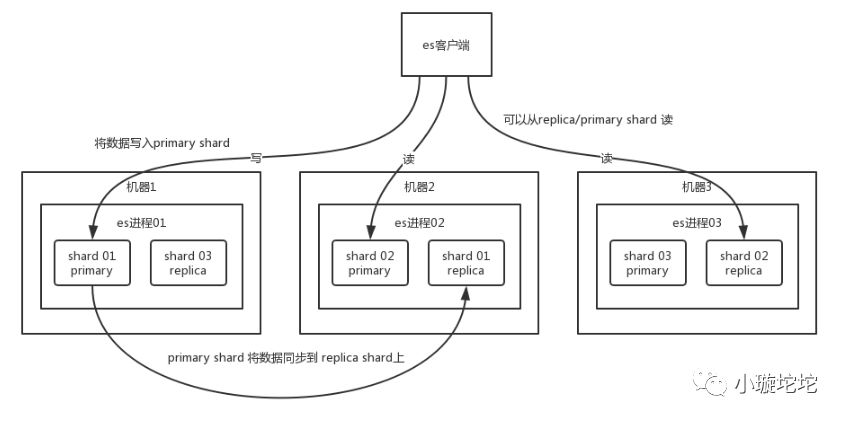 接着就是多个shard的数据实际是有多个备份,就是说每个shard都会有个primary shard,负责写入数据,但是有多个replica shard。primary shard写入数据之后,会将数据同步到其他几个replica shard上去。