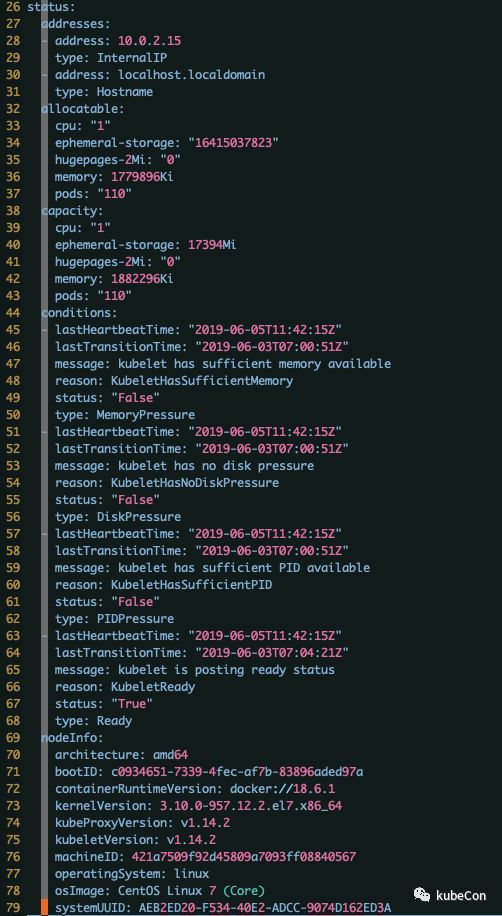 可以看到 node 所有的状态的信息,其中 status 中的信息都是 kubelet 需要上报的,所以 kubelet 不止上报心跳信息还上报节点信息、节点 OOD 信息、内存磁盘压力状态、节点监控状态、是否调度等。