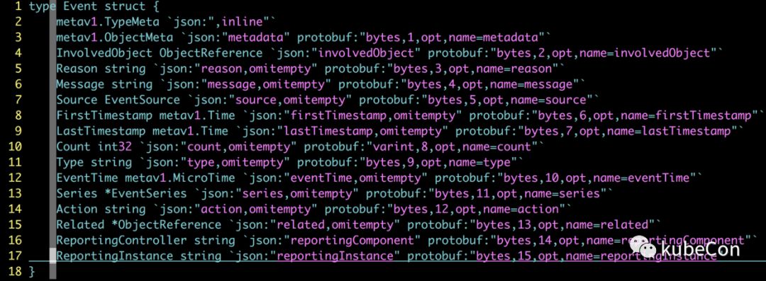 其中 InvolvedObject 代表和事件关联的对象,source 代表事件源,使用 kubectl 看到的事件一般包含 Type、Reason、Age、From、Message 几个字段。