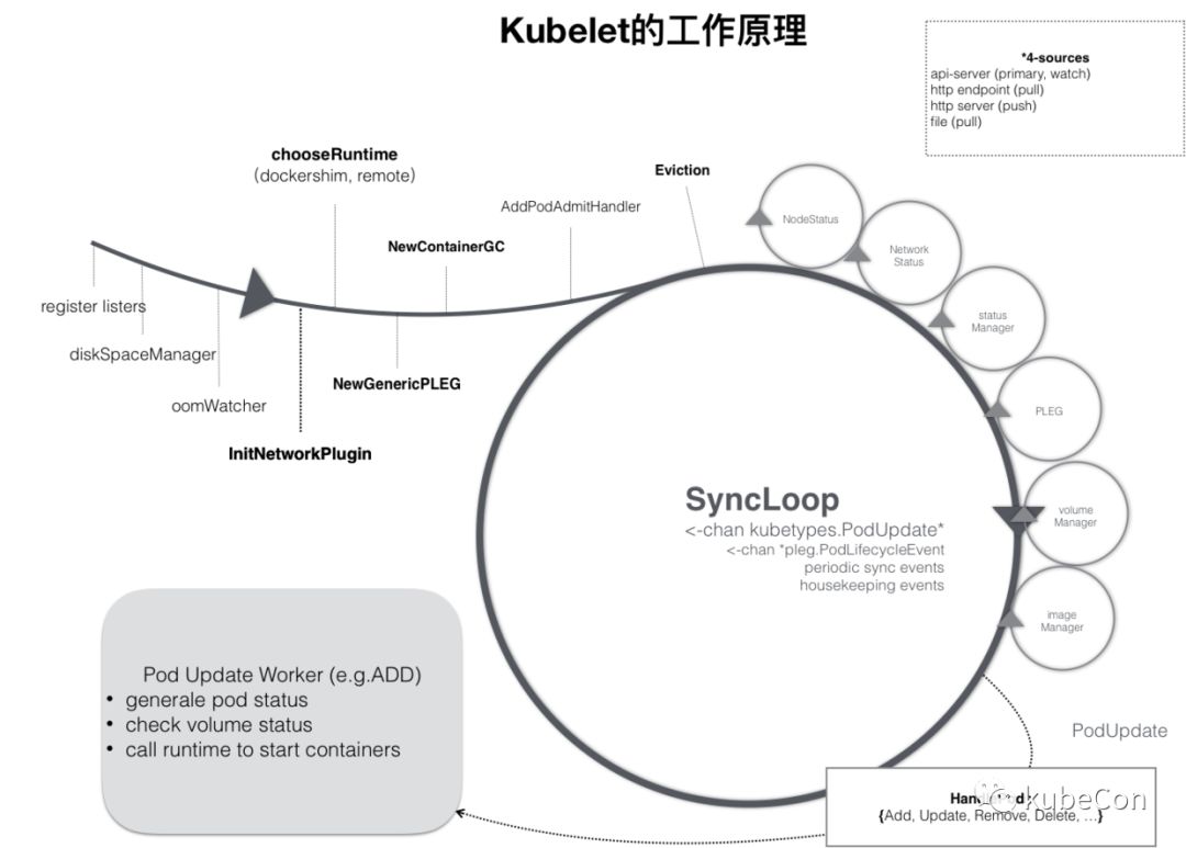 kubelet 的工作核心就是在围绕着不同的生产者生产出来的不同的有关 pod 的消息来调用相应的消费者(不同的子模块)完成不同的行为(创建和删除 pod 等),即图中的控制循环(SyncLoop),通过不同的事件驱动这个控制循环运行。
