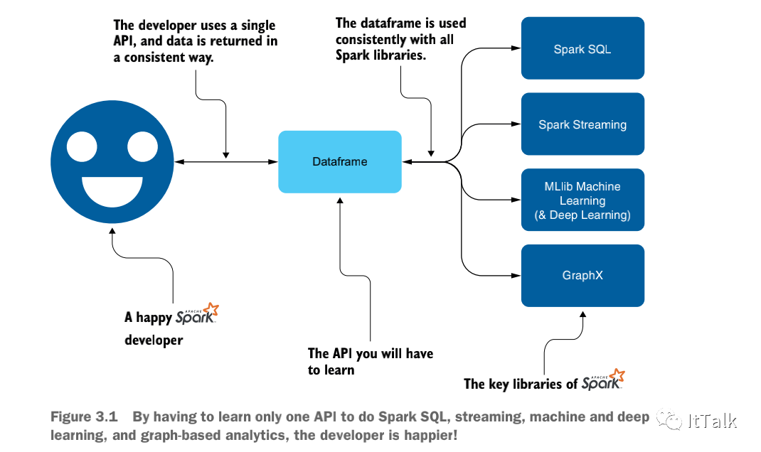 Spark的dataframe API在Spark SQL、Spark Streaming、MLlib(用于机器学习)和GraphX中使用(在Spark中操作基于图的数据结构)。使用这个统一的API可以极大地简化对这些技术的访问。你将不必为每个子库学习一个API。将dataframe描述为雄伟的dataframe可能很奇怪,但这个限定词非常适合它。就像雄伟的艺术品吸引着人们的好奇心,雄伟的橡树主宰着森林,雄伟的城墙保护着城堡一样,dataframe在Spark的世界里也是雄伟的。