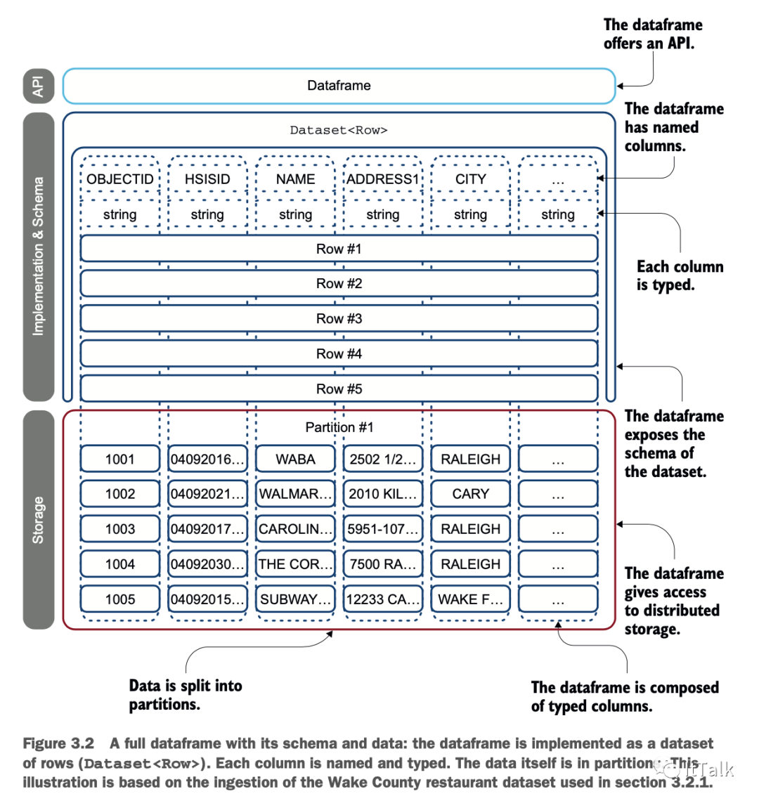 在本节中,你将学习什么是dataframe以及它是如何组织的。你还将学习到不可更改性。一个dataframe既是一个数据结构,也是一个API,如图3.1所示。