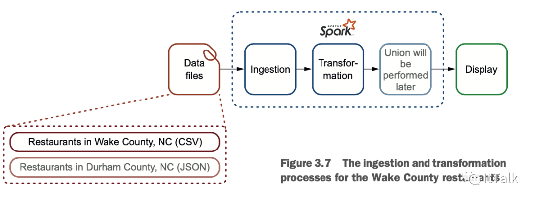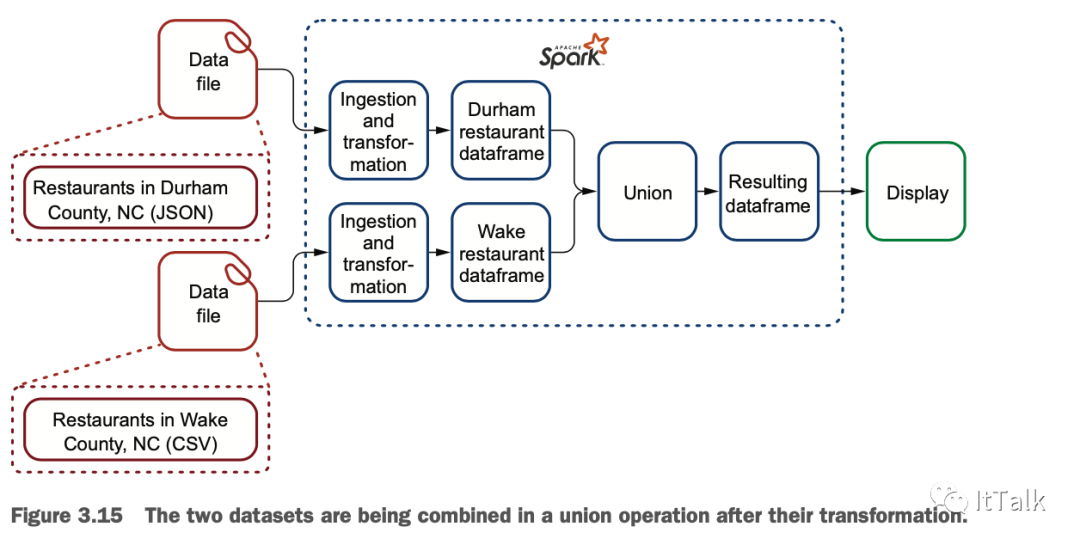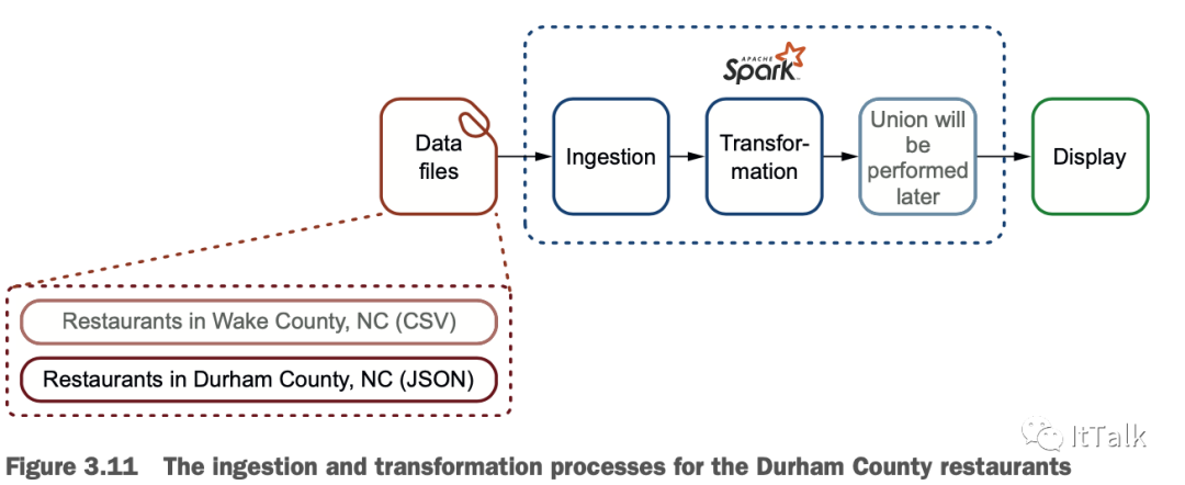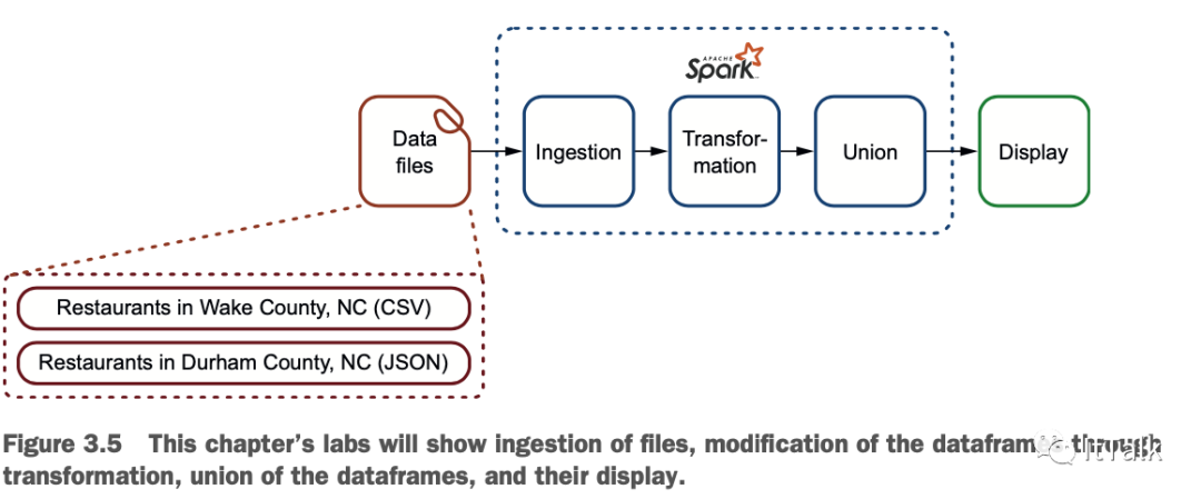 没有什么比一个小例子更适合开始了。你摄取了第1章和第2章的文件。但之后会发生什么呢?在本节中,你将执行两个简单的摄取。然后,你将研究它们的schema和存储,以便了解dataframe在应用程序中使用时的行为。第一个摄取是北卡罗来纳州维克县的餐馆列表。第二个数据集由北卡罗来纳州达勒姆县的餐馆组成。然后,您将转换数据集,以便您可以通过联合来合并它们。这些都是你作为Spark开发者将要执行的关键操作,所以了解它们背后的原理将为你提供所需的基础。图3.5说明了这个过程。