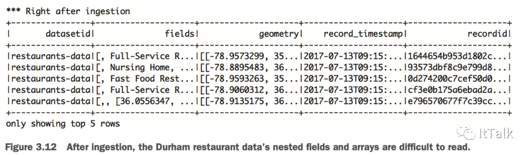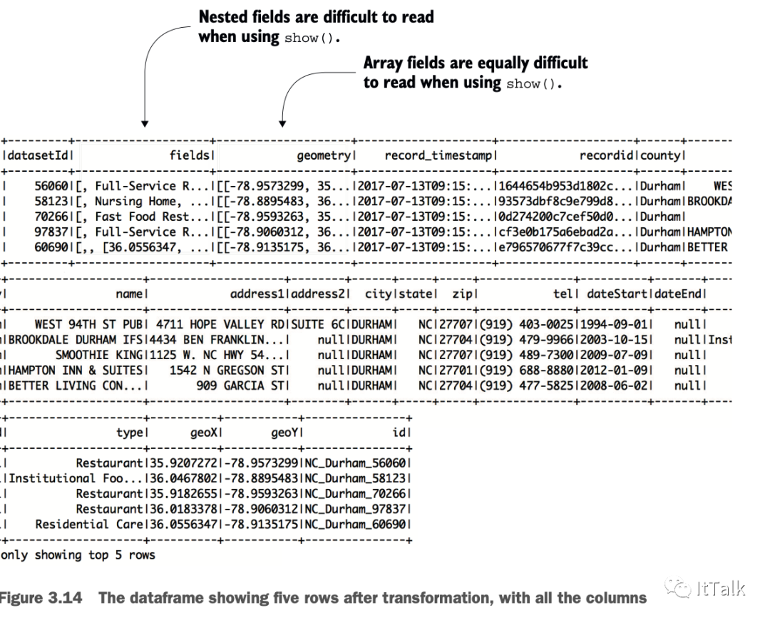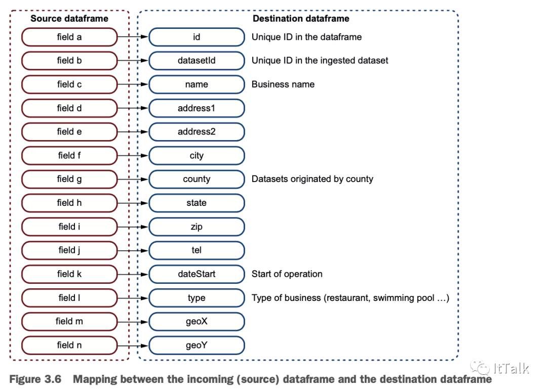 在本节中,您将首先摄取数据,然后您将查看dataframe中的数据,以了解schema。这个过程是你理解Spark工作方式的重要一步。这个例子的目标是规范化一个数据集,使它符合特定的标准,就像你刚才在图3.6中看到的那样。我打赌你喜欢去餐馆。也许不是每天都去,也许不是每一种,但你们每个人都有偏好:食物的类型、离家的距离、公司、噪音水平等等。Yelp或OpenTable等网站有丰富的数据集,但我们还是来探讨一些开放的数据。图3.7说明了这个例子中的过程。