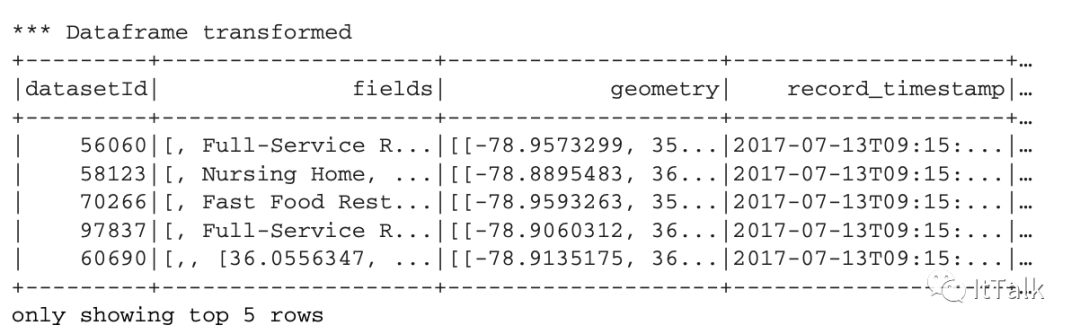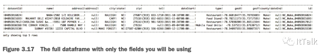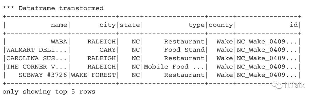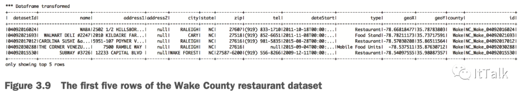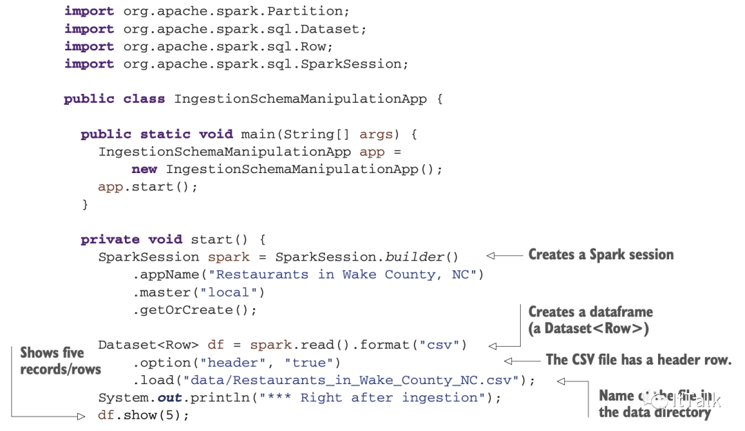 我们先来看看代码。导入是一样的。为了更简单一些,SparkSession的实例是一个私有成员,在start()方法中初始化。代码的其余部分被隔离在三个方法中。buildWakeRestaurantsDataframe() 构建包含Wake县餐馆的dataframe