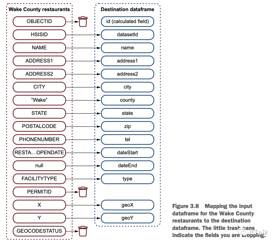 你的第一个数据集来自北卡罗来纳州的Wake县,网址是http://mng.bz/5AM7。它包含了该县的餐馆列表。这些数据可以直接从 http://mng.bz/Jz2P 下载。现在您将进行dataframe的摄取和转换,使其与输出相匹配(通过重命名和丢弃列);然后您将对数据分区进行范围划分。当你在摄取和转换数据时,你还会统计记录的数量。图3.8说明了映射的情况。