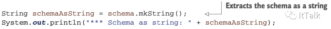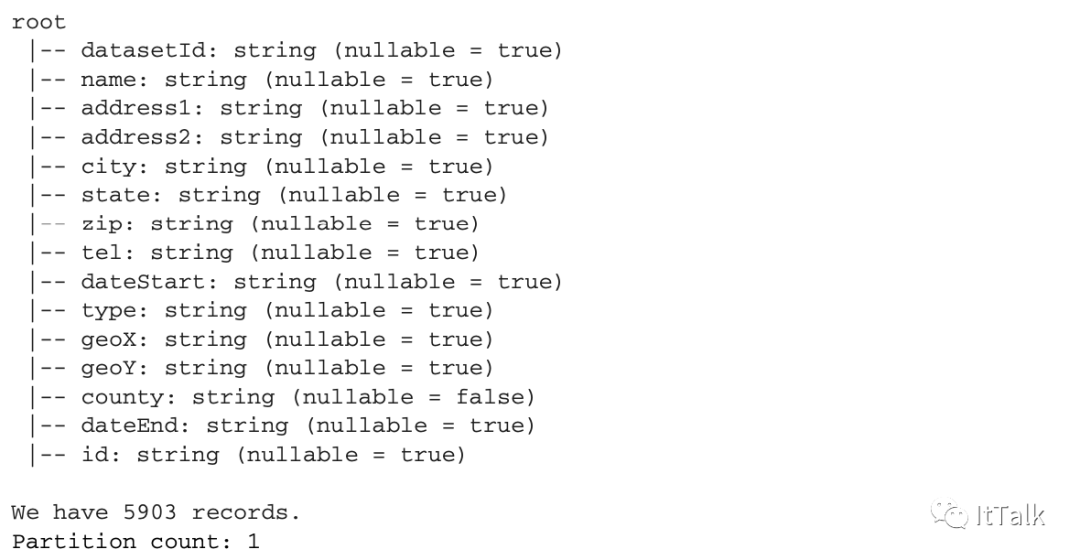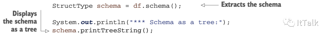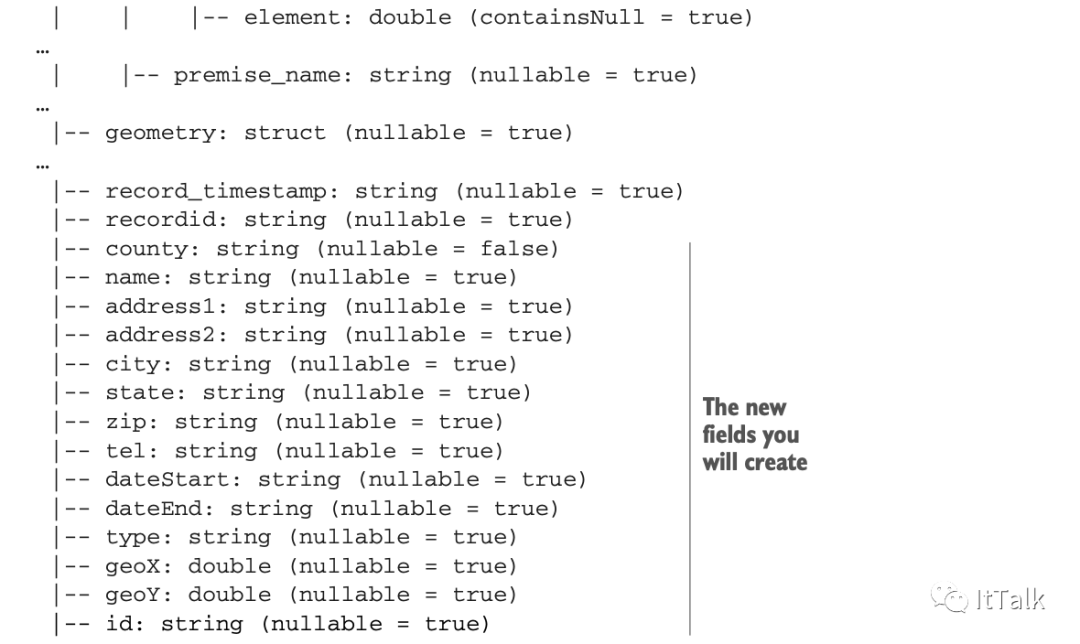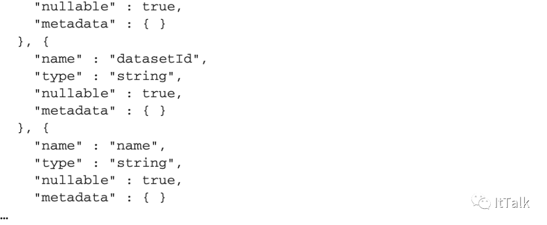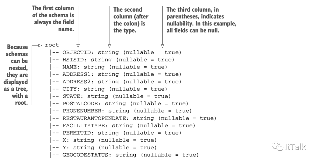 在上一节中,你学习了通过使用printSchema()来查看Schema。了解数据的结构,特别是Spark如何看待数据是很重要的。你可以通过调用schema()方法了解更多关于schema的细节。查看net.jgp.books.spark.ch03.lab210_schema _introspection包中的SchemaIntrospectionApp,可以了解schema()使用的细节。为了简化阅读,我把下一个lab的输出-放限制在每种情况下的前三个字段。比如说你想输出以下内容。*** Schemaas a tree: