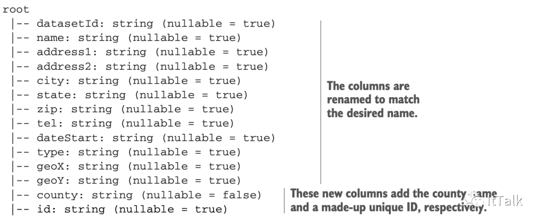 本节的目标是让你合并两个dataframe,就像你可以执行两个表的SQL联合一样。为了使联合有效,你需要在两个dataframe中使用类似命名的列。为了达到这个目的,你可以很容易地想象,你的第一个数据集的schema也被修改了。这就是它的样子。