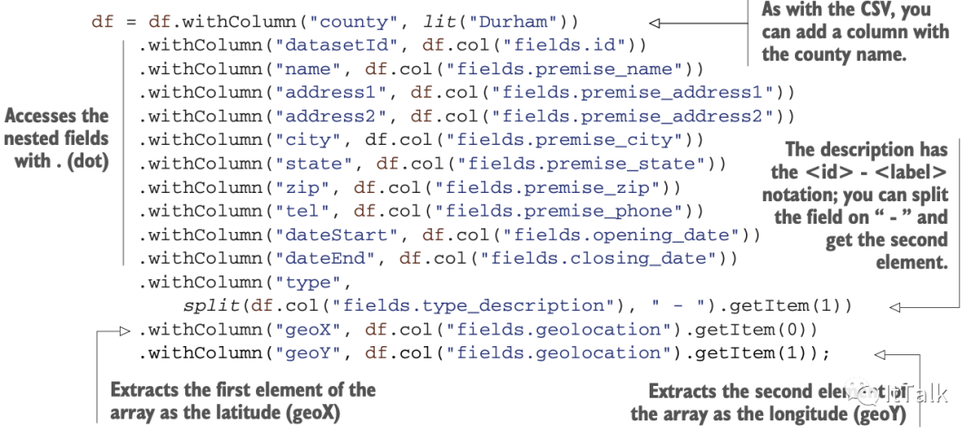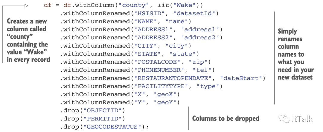 让我们来走一遍转换的过程。注意方法链的使用。正如第2章所定义的那样,Java API可以使用方法链,如SparkSession.builder().appName(...).master(...).getOrCreate(),而不是在每一步都创建一个对象并将其传递给下一个操作。你将使用dataframe的四个方法和两个静态函数。你可能很熟悉静态函数:它们是那些被 "分组 "在一个类中的函数,但不需要实例化该类。方法很容易理解:它们被附加到对象本身。当你直接对列中的值进行操作时,静态函数是很有用的。在阅读本书的过程中,你会看到越来越多地使用这些静态函数,在第13章和附录G中会有更详细的描述。如果你没有找到一个能完成你想要的功能的函数(例如,一个特定的转换形成或对你可能拥有的现有库的调用),你可以编写自己的函数。这些函数被称为用户定义函数(UDF),你将在第16章学习。现在让我们看看你需要的方法和函数。- withColumn() 方法-从一个表达式或一个列中创建一个新的列。
