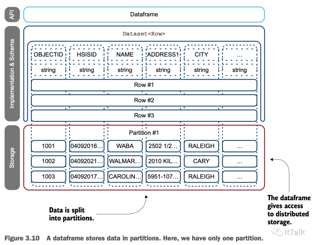 现在你已经加载了数据,你可以看到数据的存储位置。这将向你展示Spark内部是如何存储数据的。数据不是物理地存储在dataframe中,而是存储在分区中,如图3.1和简化的图3.10所示。分区不能直接从dataframe中访问,您需要通过RDD查看分区。你将在稍后的 3.4 节中了解更多关于 RDD的信息。