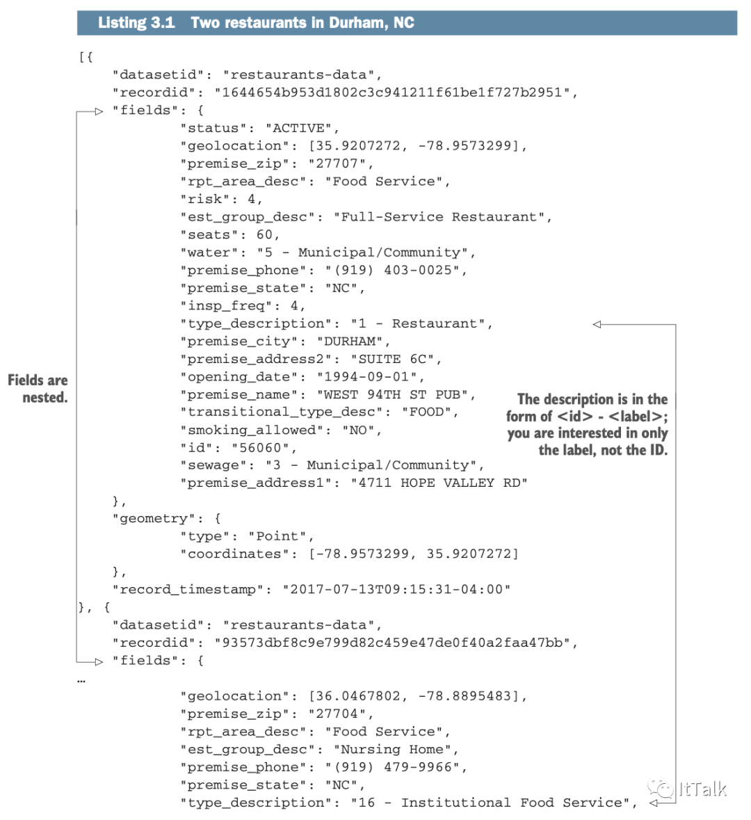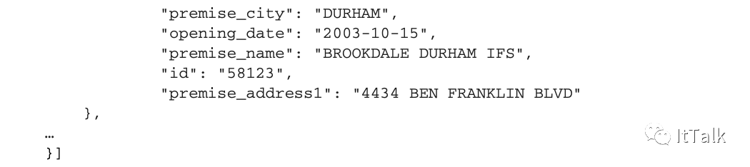 因为JSON比CSV更难可视化,所以接下来的列表显示了一个只有两家餐厅的数据集节选。JSON绝对更啰嗦,不是吗?我删除了第二条记录的一些字段。