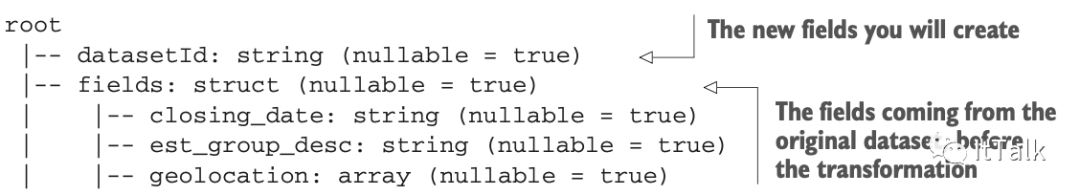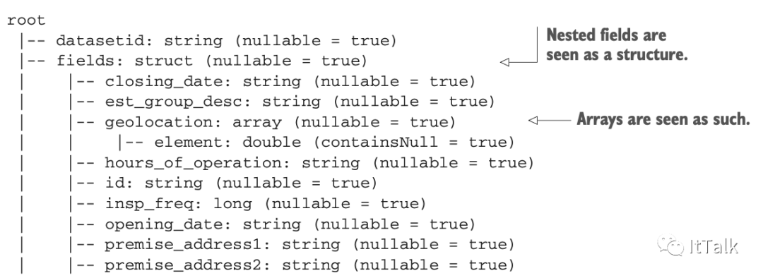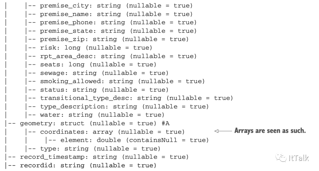 当然,这个schema tree的结构与清单3.1中的JSON文档的结构类似。而且这个结构现在看起来肯定比CSV文件更像一棵树。制作这个的代码也与摄取和转换CSV数据集的代码类似。