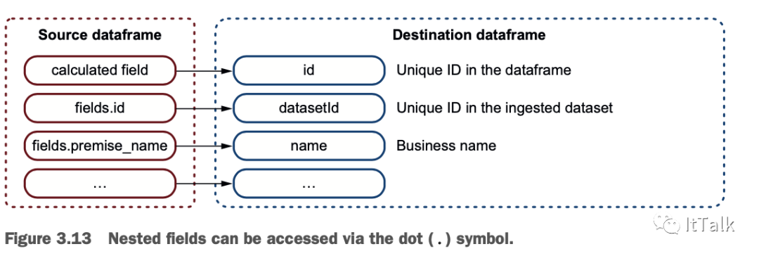 一旦数据在dataframe中,操作数据的API是一样的。你可以开始转换dataframe了。你的目标结构是扁平的,所以映射(如图 3.13 所示)必须包含嵌套字段。