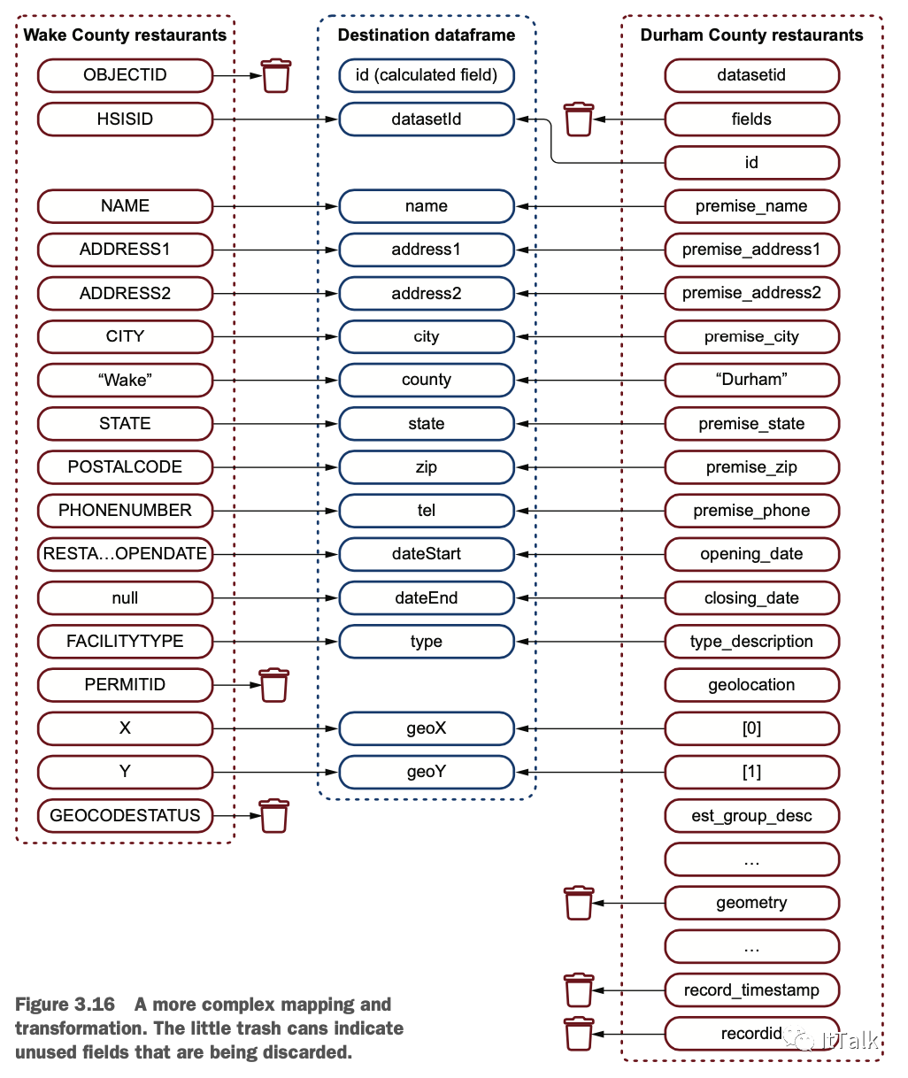 你当然可以想象,你可以重用你为摄取和转换所写的大部分代码。然而,要执行union,你必须确保schema是严格相同的。否则,Spark将无法执行union。图 3.16 展示了你要做的映射。