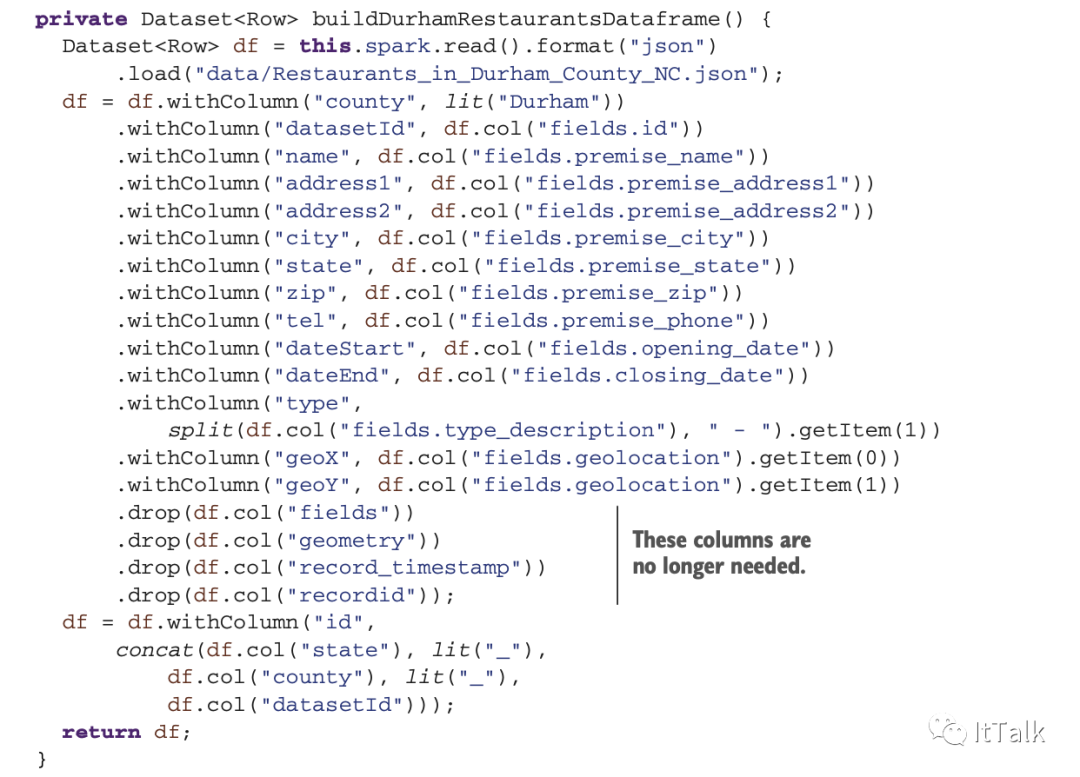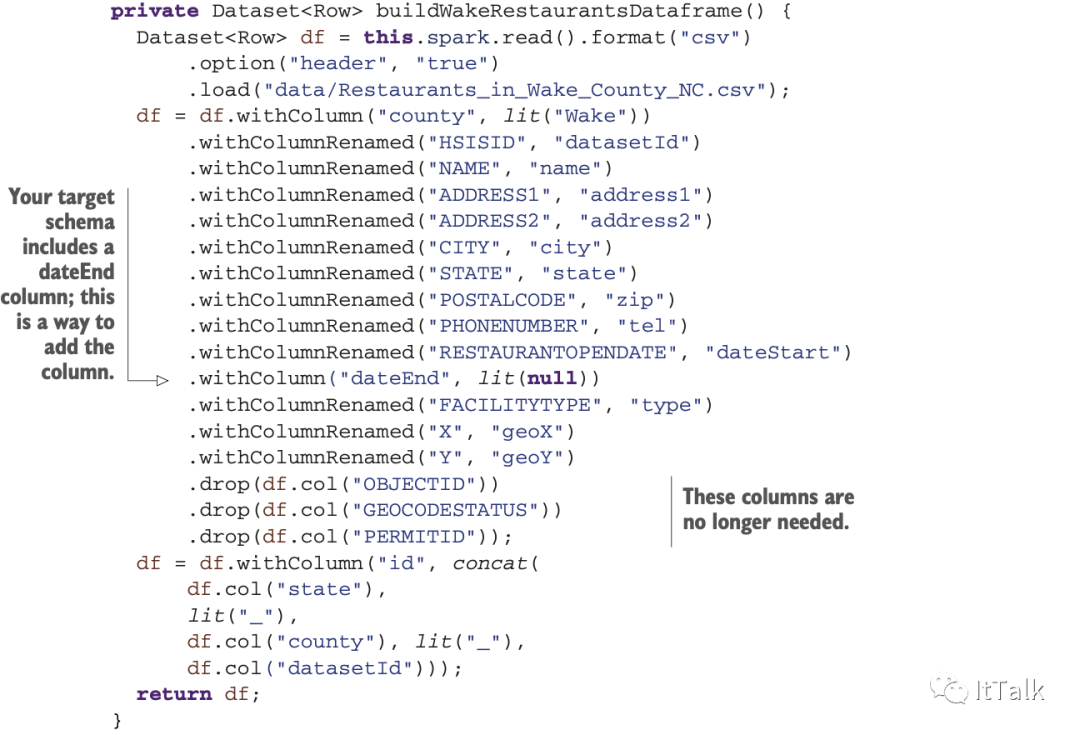 这是最简单的部分,对吧?让我们来分析一下这些方法,首先是buildWakeRestaurantsDataframe(),它从CSV文件中读取数据集。这个你应该很熟悉,因为你之前在3.2.1节看到过这个。