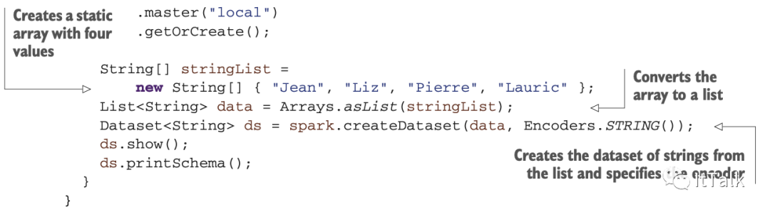 为了理解如何使用dataset而不是dataframe,让我们看看如何创建一个简单的String的dataset。这将通过使用一个我们都熟悉的简单对象--字符串来说明dataset的用法。然后你将能够创建更复杂对象的dataset。你的应用程序将从一个简单的包含字符串的Java数组中创建一个String的dataset,然后显示结果--没有任何花哨的东西。下面是预期的输出。
