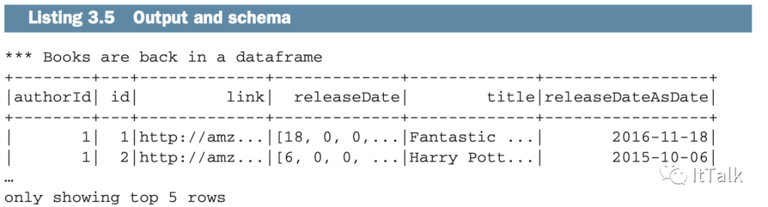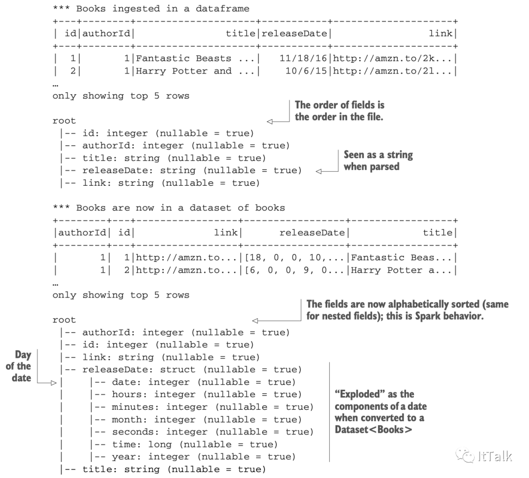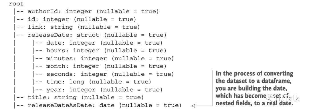 现在你已经有了dataset,你可以把它转换回dataframe,这样你就可以,例如,执行连接或聚合操作。所以,让我们把dataset转换回dataframe来研究这部分机制。你将研究一个有趣的日期案例,因为日期被分割成一个嵌套结构。下面的列表显示了输出结果。
