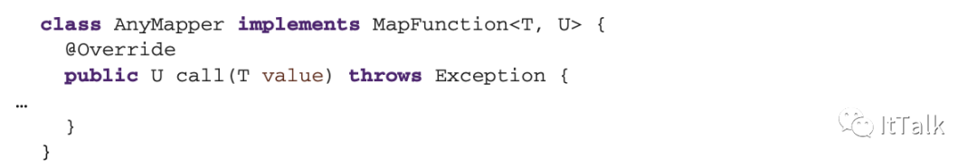 让我们深入了解一下map()方法的签名。在Java中,泛型并不总是简单的。 Dataset<U> map(MapFunction<T, U>, Encoder<U>)