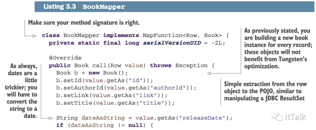 让我们来探讨一下在你的dataset API中直接重用POJO的好处,并多了解一些关于Spark存储的知识。使用dataset而不是dataframe的主要好处是,你可以直接在Spark中重用你的POJO。使用dataset与你的POJO可以让你使用你熟悉的对象,而没有Row可能带来的任何限制,比如从中提取数据。当你看dataset API(http://mng.bz/qXYE)时,你会看到很多对dataset的引用,其中T代表一个通用类型,而不是具体的Row。然而,要注意的是,有些操作会失去POJO的强类型,而返回一个Row:一个例子是加入两个数据集或在一个数据集上执行聚合。这完全不是一个问题,但应该是一个预期的特征。例如,考虑一个基于书籍的数据集。如果你通过分组来统计按年份出版的书籍数量,你的书籍POJO中不会有一个计数字段,所以Spark会自动创建一个dataframe来存储结果。最后,Row使用了名为Tungsten的高效存储。这不是你的POJO的情况。Tungsten:疯狂快速的Java存储