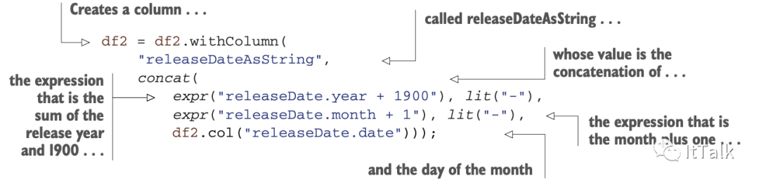 expr()静态函数将计算一个类似于SQL的表达式并返回一个列。它可以使用字段名。表达式releaseDate.year + 1900将在这个转换过程中被Spark评估,并变成一个包含该值的列。releaseDate.year中的点符号表示数据的路径,你可以在清单3.5的模式中看到。通过实例你将看到更多的静态函数,并将在第13章以及附录G中研究转换。一旦你有了一个作为字符串的日期,你可以使用to_date()静态函数将其转换为作为日期的日期。