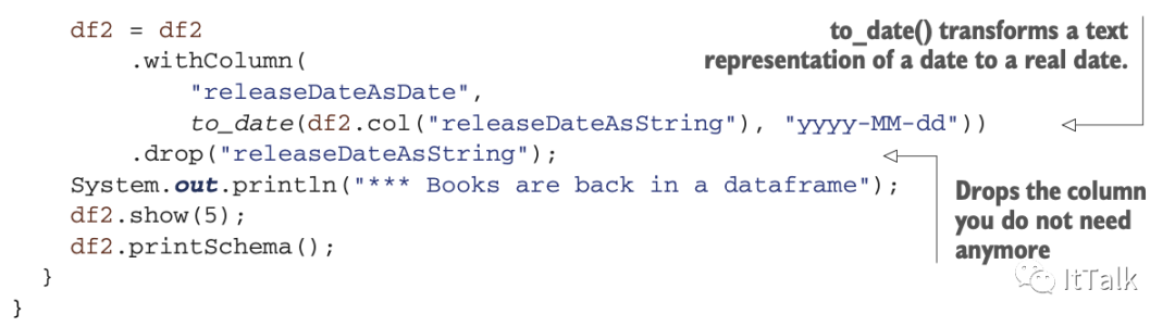 好吧,这并不难,对吧?要将一个dataset转换为dataframe,你只需使用toDF()方法。然而,你仍然有这种奇怪的日期格式,所以我们来纠正一下。第一步是将日期转换为一个具有日期表示的字符串。在这种情况下,你将使用ANSI/ISO格式。YYYY-MM-DD, 如1971-10-05。请记住,Java中的年份是从1900年开始的,所以1971年是71,而2004年是104。同样,月份从0开始,所以10月,也就是一年中的第10个月,是第9个月。使用Java方法来构建日期需要使用一个映射函数,就像你在清单3.3中做的那样。这是通过对数据的迭代来构建数据集或数据框架的方法。你也可以使用UDF,定义在第16章。