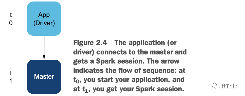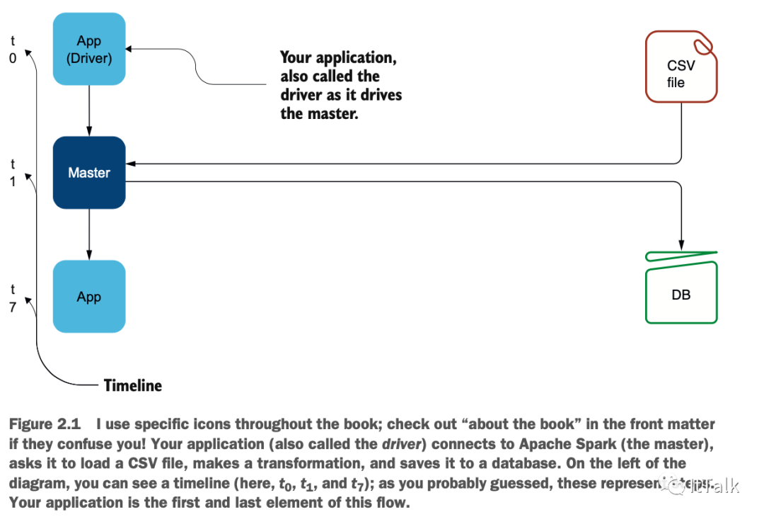 近年来,越来越多的Java API使用方法链,如SparkSession.builder().appName(...).master(...).getOrCreate()。此前,你可能看到更多的中间对象被创建,有点像这样。Object1 o1 = new Object1(); Object2 o2 = o1.getObject2(); o2.set("something")。Spark的API使用了大量的方法链。方法链让你的代码更紧凑,更易读。但一个主要的缺点是调试:想象一下在你的链中间出现一个空指针异常(NPE),你会花更多的时间来调试它。本章的所有插图都代表了一条时间线。在t0,你开始你的应用程序(你的main()函数),在t1,你得到你的会话。这第一步总是要连接到一个Master。现在你可以要求Spark加载CSV文件。