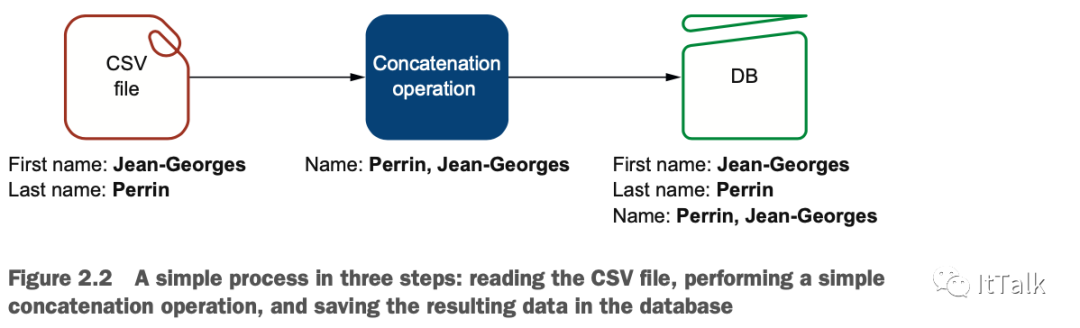 在深入研究建立心智模型的每一步之前,我们先来分析一下应用程序的整体。在本节中,你将先设定Java的 "礼节",然后再解构并深入研究每一行代码及其后果。图2.2是这个过程的基本表示。Spark读取一个CSV文件;将姓氏、逗号和名字连接起来;然后将整个数据集保存在数据库中。