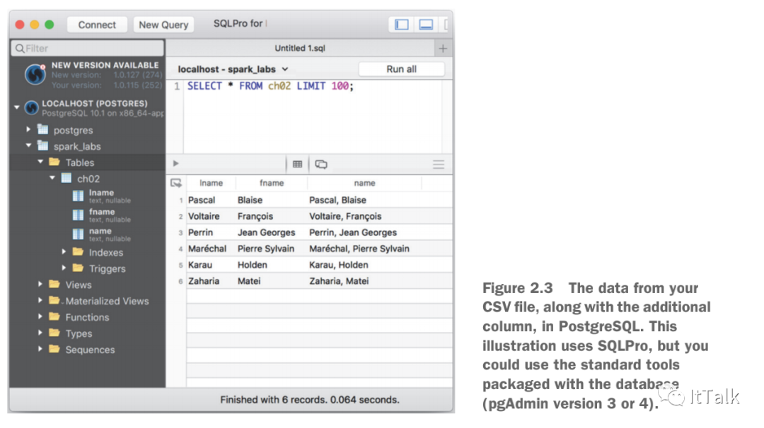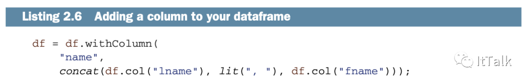 数据加载完毕后,在t5,你可以处理记录。你的操作相当简单:你将在数据框中添加一个新的列,称为name。全名(在列名中)是由姓(来自列lname)、逗号、空格和名(来自列fname)连接而成。因此,Jean-Georges(名)和Perrin(姓)变成了Perrin, Jean-Georges。清单2.6描述了这个过程,图2.8说明了这个过程。