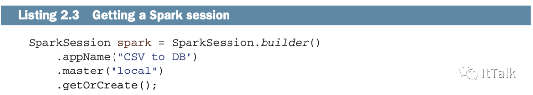 对于每一个Spark应用,第一个操作是连接到Spark master,并获得一个Spark会话。这是你每次都要做的操作。这一点通过清单2.3中的代码片段和图2.4来说明。在这种情况下,你是以本地模式连接到Spark。你将在第5章中发现连接和使用Spark的三种方法。