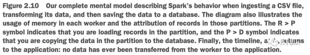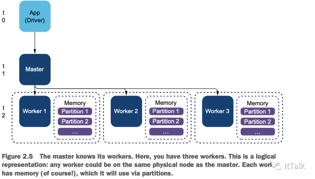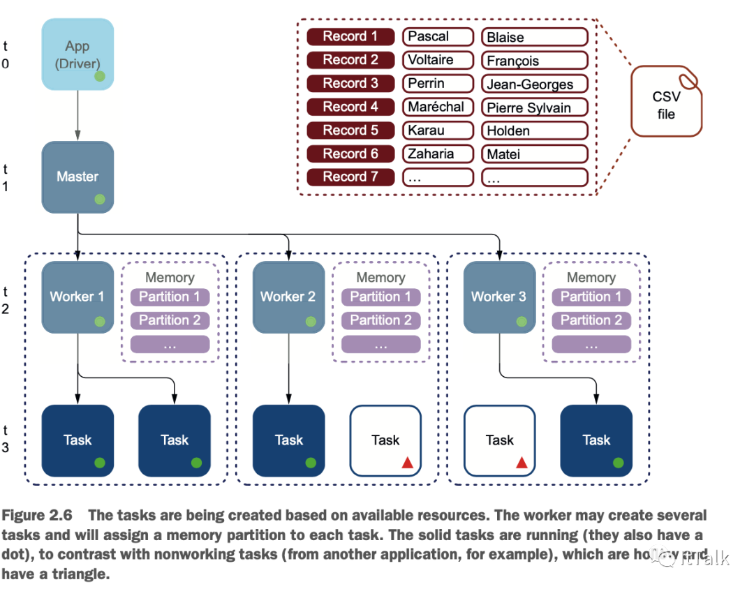 在t2,master告诉worker加载文件,如清单2.4中的编码。你可能会想,"如果你有三个工人,哪一个在加载文件?"或者 "如果他们同时加载,他们怎么知道在哪里开始和结束?" Spark将以分布式方式摄取CSV文件。文件必须在共享驱动器、分布式文件系统(如第18章中的HDFS)上,或通过共享文件系统机制(如Dropbox、Box、Nextcloud或ownCloud)共享。在这种情况下,分区是工人内存中的一个专用区域。