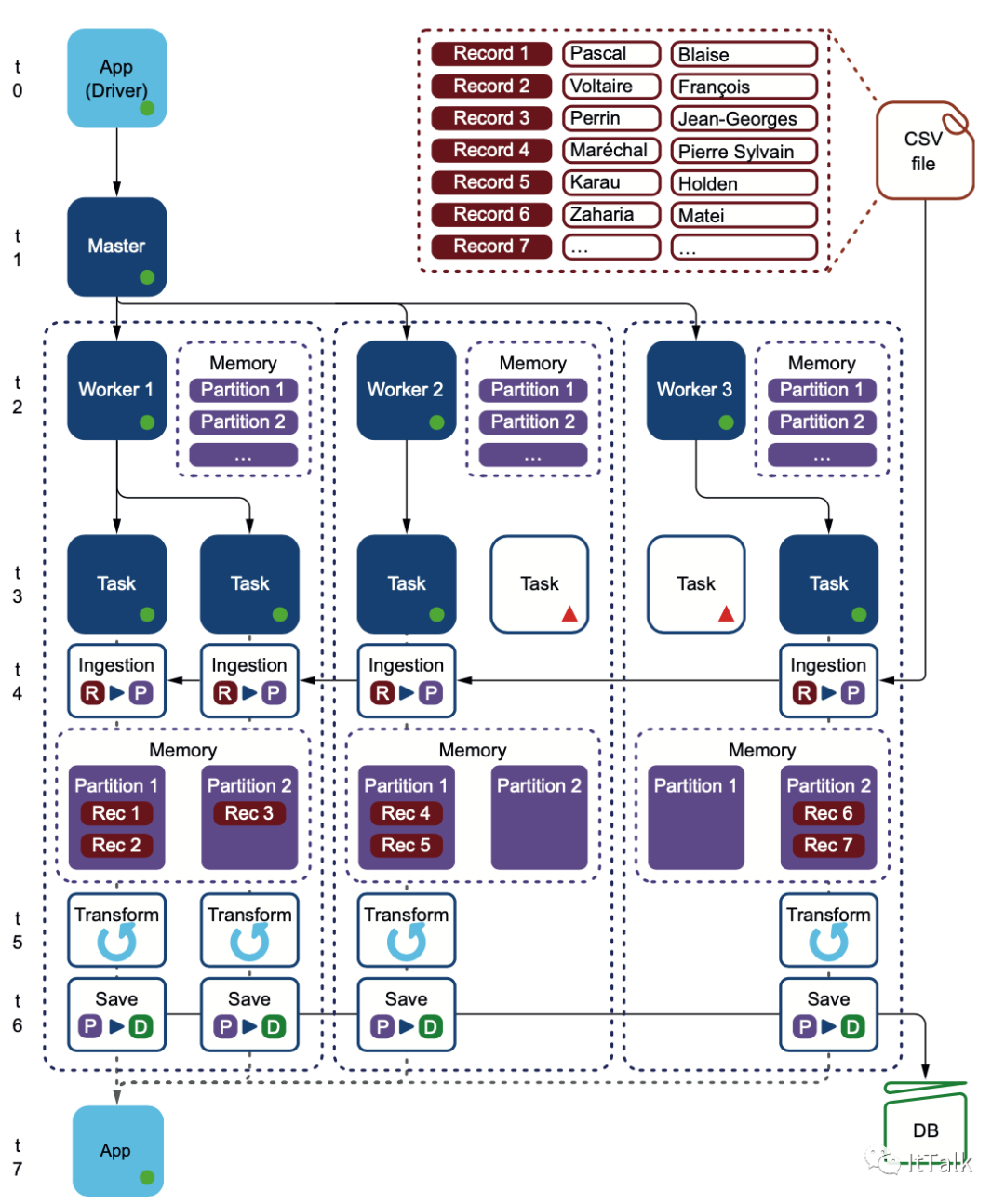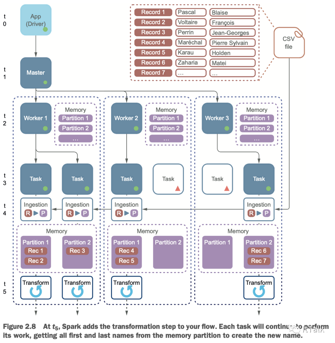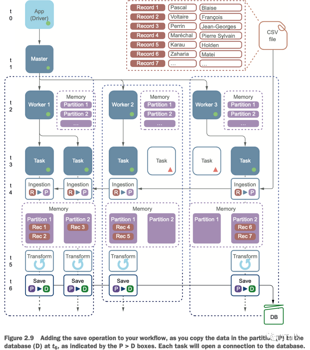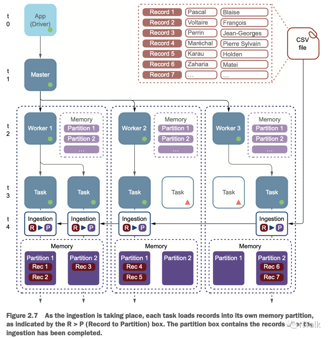Worker将创建任务来读取文件。每个worker都可以访问节点的内存,并为任务分配一个内存分区,如图2.6所示。在t4,每个任务将继续读取CSV文件的一部分,如图2.7所示。由于任务正在摄取它的行,它将它们存储在一个专用的分区中。图2.7显示了在摄取过程中从CSV文件复制到分区的记录,在R > P(Record to Partition)框内。内存框中显示了哪些记录在哪个分区中。在这个例子中,包含Blaise Pascal的记录1在第一个worker的第一个分区中。