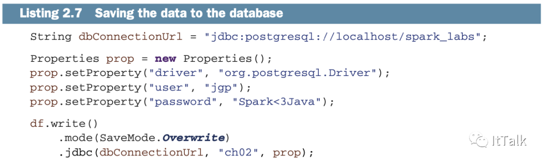 就像塞斯-罗根说的那样:"我很懒,但不知道为什么,我太偏执了,以至于我最终还是努力工作。"这就是Spark的行为。这个时候,你让Spark去连接字段,但它什么也没做。Spark是懒惰的:只有在被要求时它才会工作。Spark会把你所有的请求堆积起来,当它需要的时候,它会优化操作,做艰苦的工作。你将在第4章更仔细地研究它的懒惰。而且,就像Seth一样,当你要求得很好的时候,Spark会非常努力地工作。在这种情况下,你使用的是withColumn()方法,这是一种转换。Spark只有在看到一个操作时才会开始处理,比如清单2.7中的write()方法。现在你已经准备好了最后一个操作:将结果保存在数据库中。