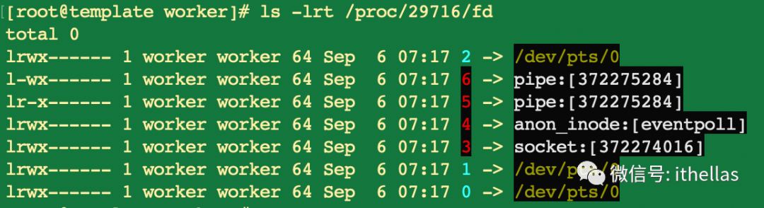 如果是进程在代码中查看自己占用的文件描述符时,则可以直接访问/proc/self/fd这个目录,因为/proc/self其实就是指向/proc/<pid>的一个链接。Golang代码如下,